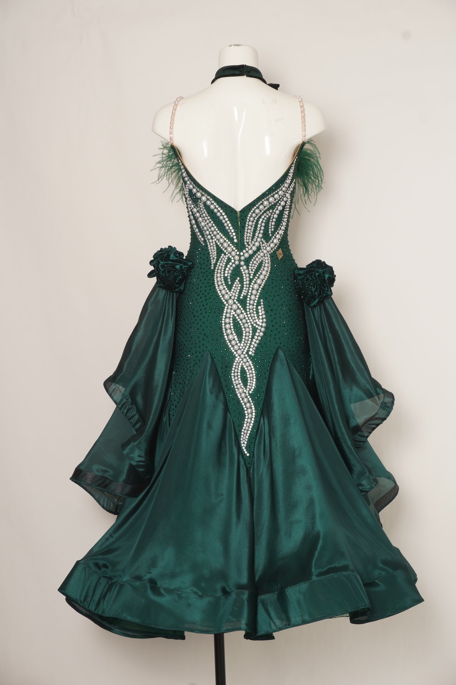This couture Ballroom gown features a feathered bust with pearl shoulder straps. The crystallized bodice is adorned with waving pearl patterns on the front and back, while the long, frilled arm accessories are adorned with rose appliques to highlight moves.