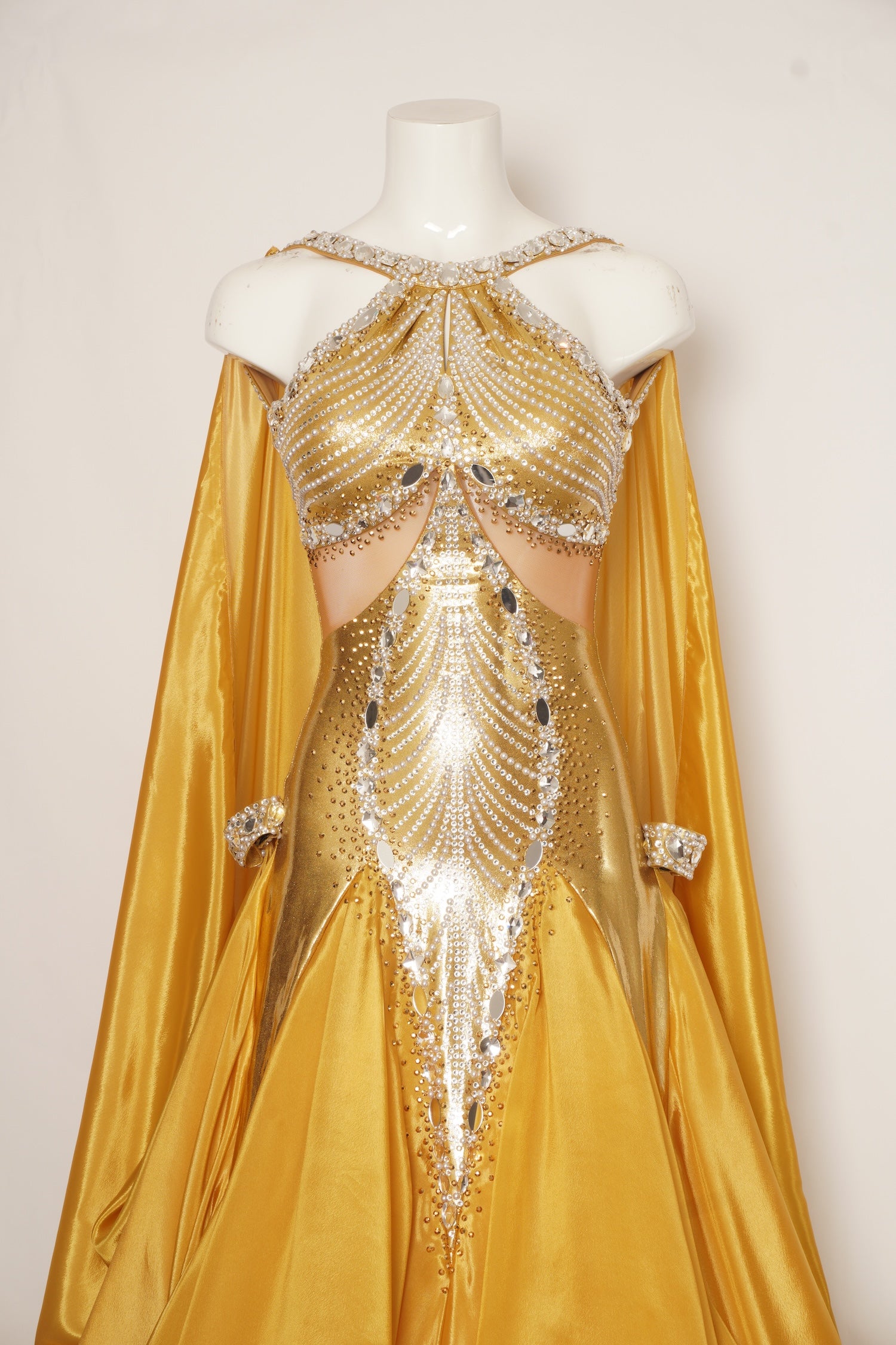 This couture Ballroom gown features a crystallized halter neck and a metallic bust and bodice adorned with pearl and reflective ornaments. Narrow cutouts with mesh inserts adorn the bodice sides, while long floats highlight moves and crystal strands drape in the back.