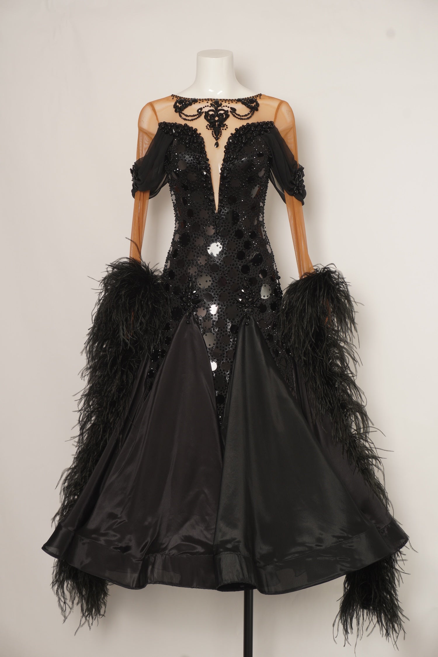 This shimmering Ballroom gown features an ornate design on the yoke and off-the-shoulder draped sleeves with feather floats. The entire bodice is adorned with crystal and large sequin detailing, while the godet skirt is voluminous for stunning twirls.