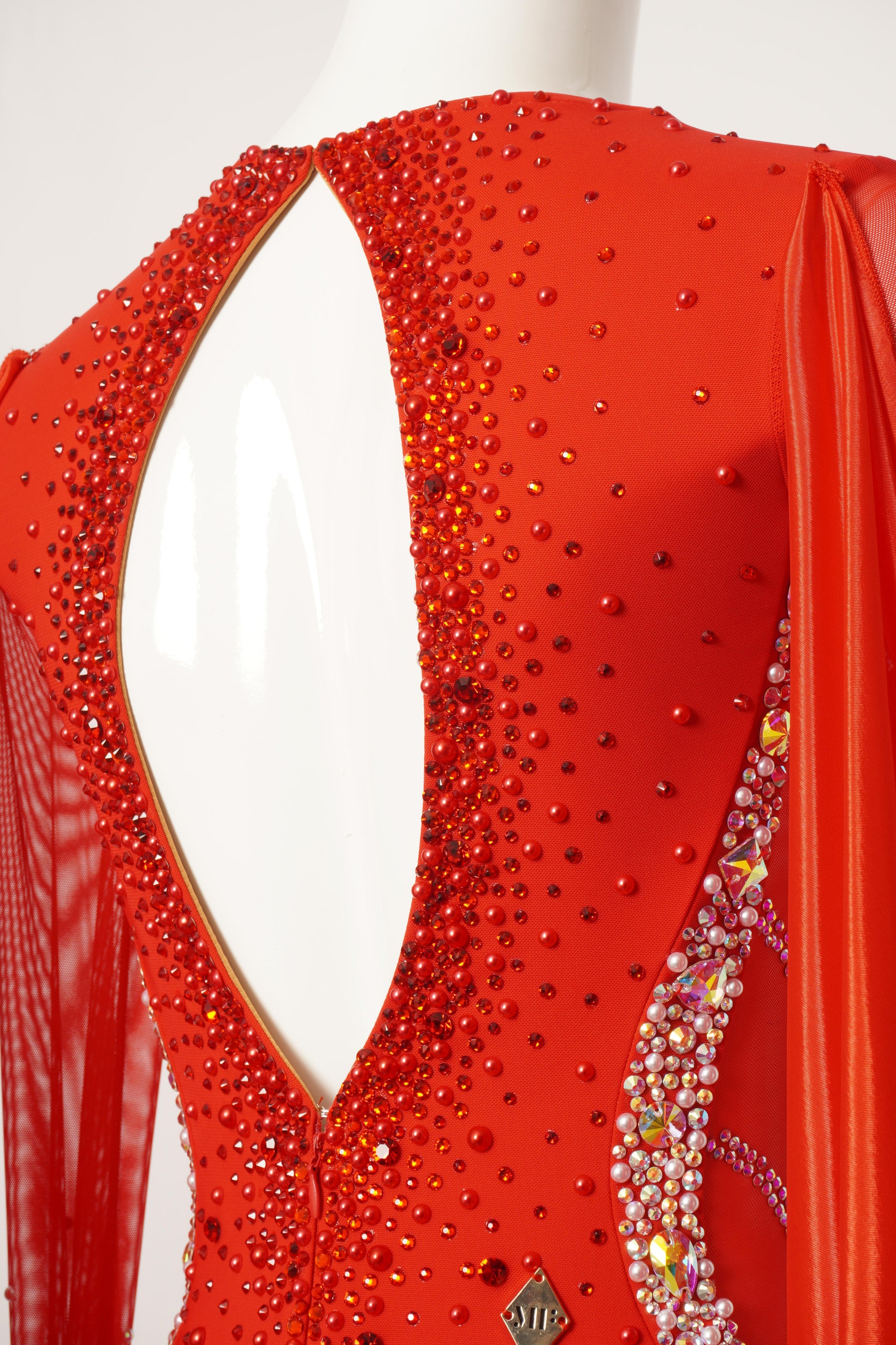Channel the drama of flame-kissed embers in this long-sleeve ballroom masterpiece. Feathers burst from the cuffs like sparks leaping from a bonfire, enhancing the fluidity of waltz or foxtrot movements. The stretch-lace sleeves contour to your arms, while the open back adds a daring touch.