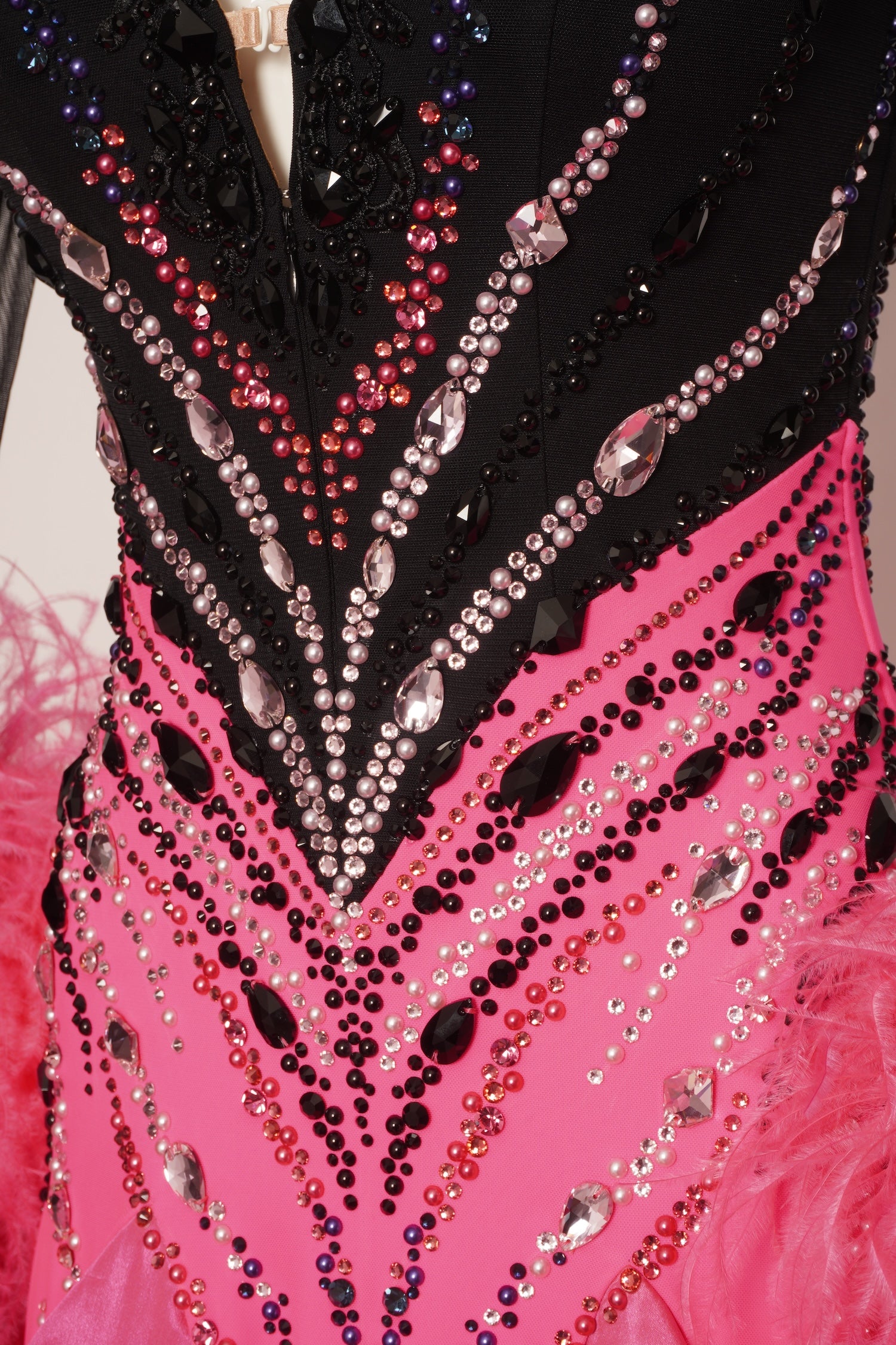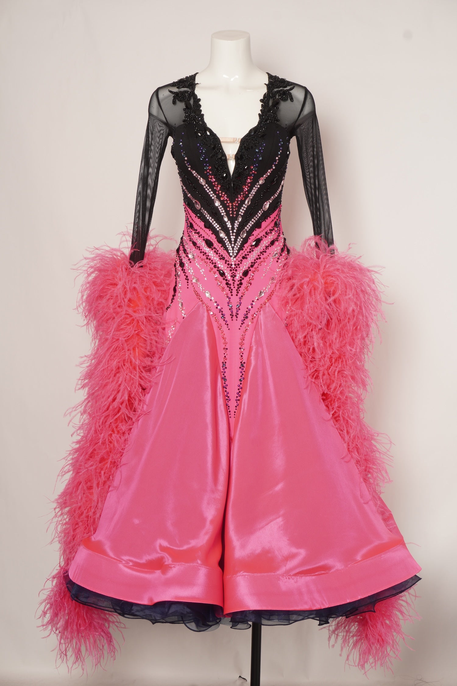 This Ballroom gown features a plunging V-neck that is trimmed with intricate appliques and crystal detailing. V shaped crystal patterns adorn the bust and bodice, while long feather floats highlight moves. The back is sheer mesh and trimmed with intricate applique detailing.